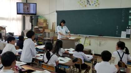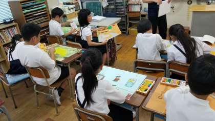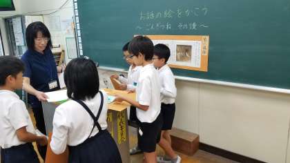 国語科の学習です。1組では、学習した内容を絵に描いていました。2組もしっかりと意見発表ができていました。