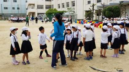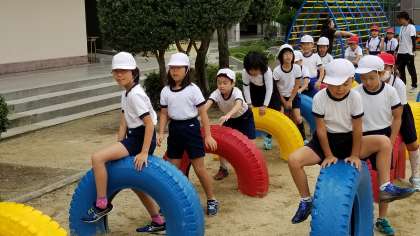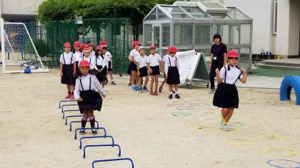 今日の体育朝会は、ケンステップやミニハードルを使った運動です。他には「ことりおに」や綱引きです。