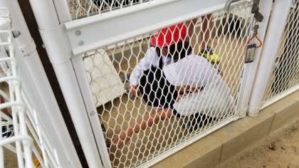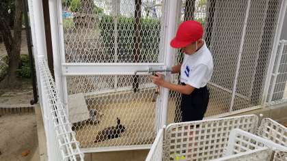 子どもたちはうさぎが大好きです。順番にうさぎ小屋に入りふれあっていました。