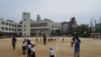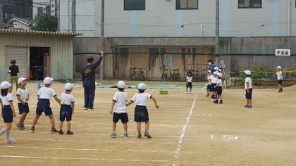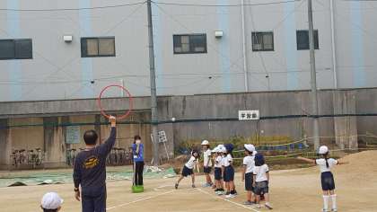 西脇先生の持つ赤いリングに向かって投げていましたが、ボールを投げる経験が少ない子どもたちは苦戦していました。これからどんどん投げて、距離を伸ばしていきましょう。