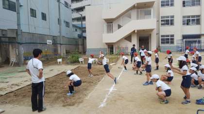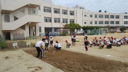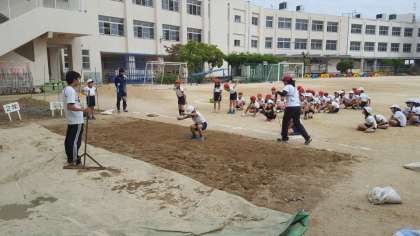 3年生は、立ち幅跳びを行いました。練習した後に実際に測定しました。腕を大きく振って、前傾姿勢で跳ぶと距離が伸びます。みんな一生懸命にがんばっていました。