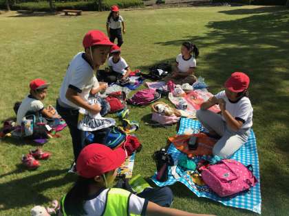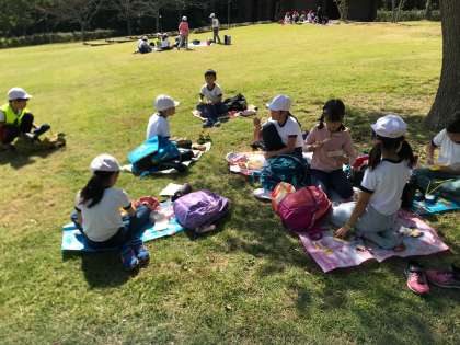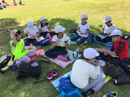 お弁当の様子です。芝生の上で食べました。風も爽やかでとても美味しくいただきました。