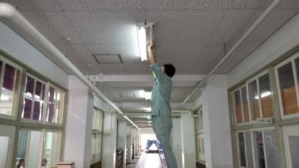 管理作業員の阪口さんが、廊下の電球を取り換えています。子どもたちの学習環境をしっかりと維持してくれています。