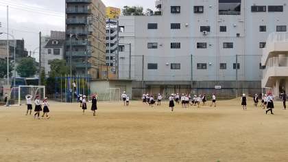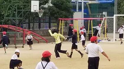 お昼休みの様子です。ぽつりと雨が落ちそうな天気ですが、みんな元気に遊んでいます。先生も一緒に鬼ごっこをしているのでしょうか。走り回っています。