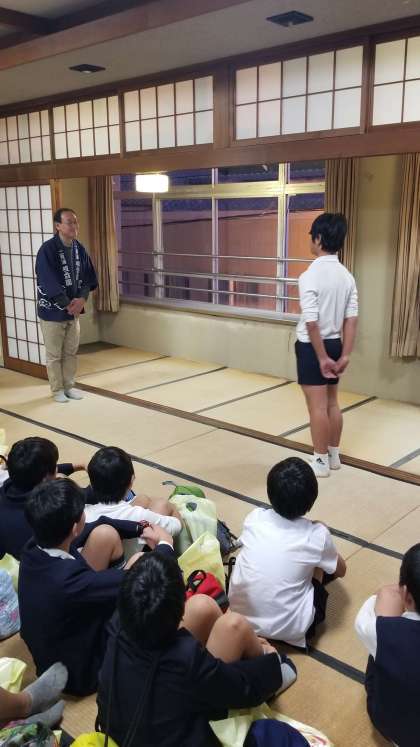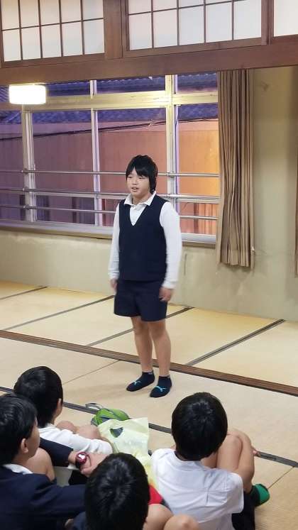 宿舎「吸霞園」に到着しました。開舎式の様子です。代表の児童がしっかりと挨拶を行いました。