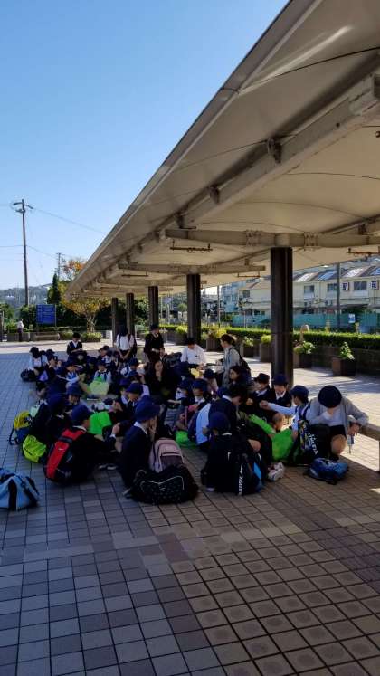 鳥羽駅は他校で混雑しています。駅前のスペースで待機しています。この後、予定通りの青空号で帰ります。