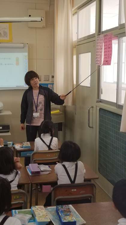 2年1組の授業の様子です。算数の九九の学習です。教室に入る時も、九九を唱えないと中には入れないようです。