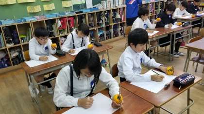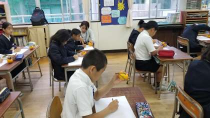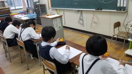 5年1組の図工の様子です。天小で収穫した柿を描いています。先生の指示どおり、しっかりと見て描いています。