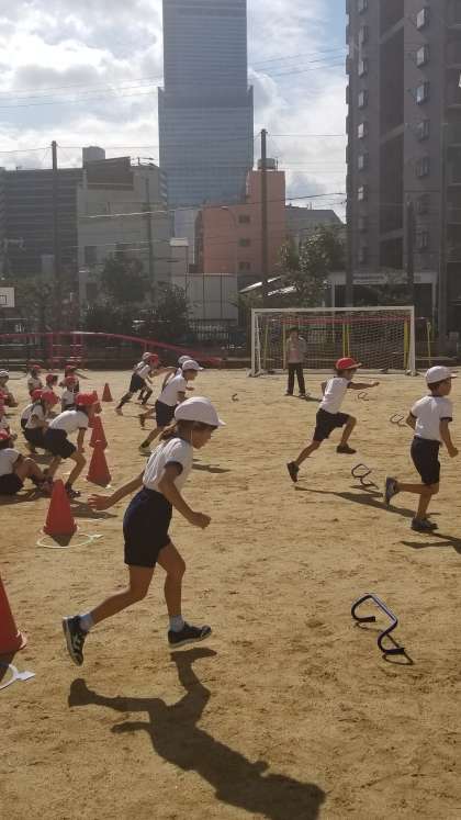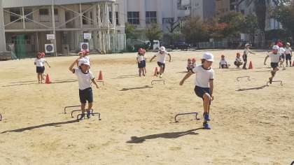 体育の様子です。障害物を両足で飛び越して速さを競う運動です。チームで相談してどの位置に障害物を置くか考えていました。