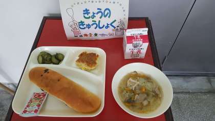 今日の献立は、ツナポテトオムレツ・スープ・きゅうりのバジル風味サラダ・パン・牛乳です。