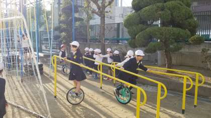 電車ごっこをして遊ぶ1年生や、ドッジボールの線を引く5年生です。