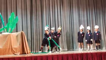 国語科で学習した「大きなかぶ」を英語と日本語で楽しく表現しました。歌・合奏「きらきらぼし」は、英語の歌詞で歌います。一人一人が自分の役割をがんばり、みんなが気持ちを合わせて発表しました。