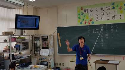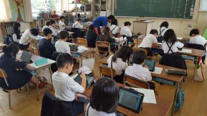 タブレット端末を使っての国語の指導です。画像を転送してモニターに写したり、発表ノートを活用したり、3年生でも十分に使いこなせています。