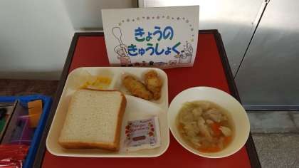 今日の献立は、白身魚のフリッター・スープ煮・大根のピクルス・パン・牛乳です。