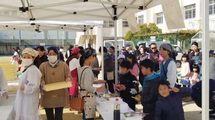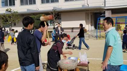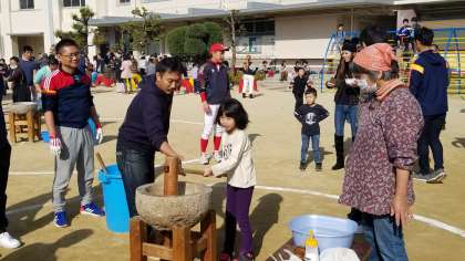 美味しいおもちに長蛇の列です。子どもたちも、もちつきを体験しました。