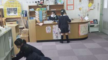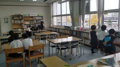 図書館の開館の様子です。図書の好きな子どもたちが開館されるのを待っています。