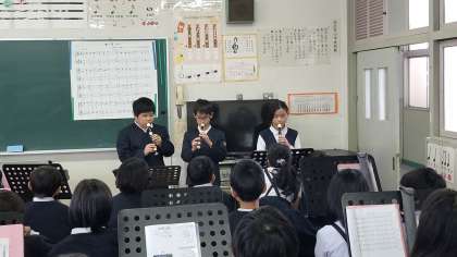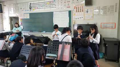 4年1組の音楽の様子です。「オーラリー」をグループで発表しています。各パートの音が重なってとてもきれいな演奏になっていました。