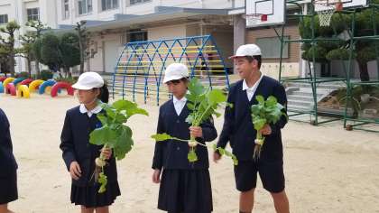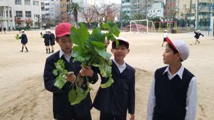 5年2組の児童が調理実習で使う天王寺かぶらを採りにいきました。いい形のかぶらができています。調理が楽しみですね。