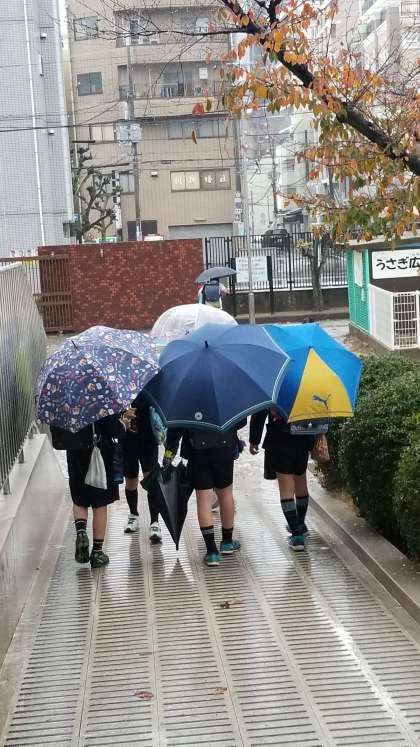 下校時に雨が降ってきました。廊下から傘をさしている子もいます。