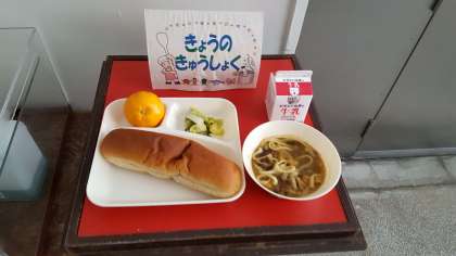 今日の献立は、カレーうどん・白菜のおひたし・みかん・パン・牛乳です。