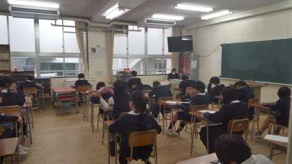 2組は、テストを受けていました。学期末には、おなじみの風景です。