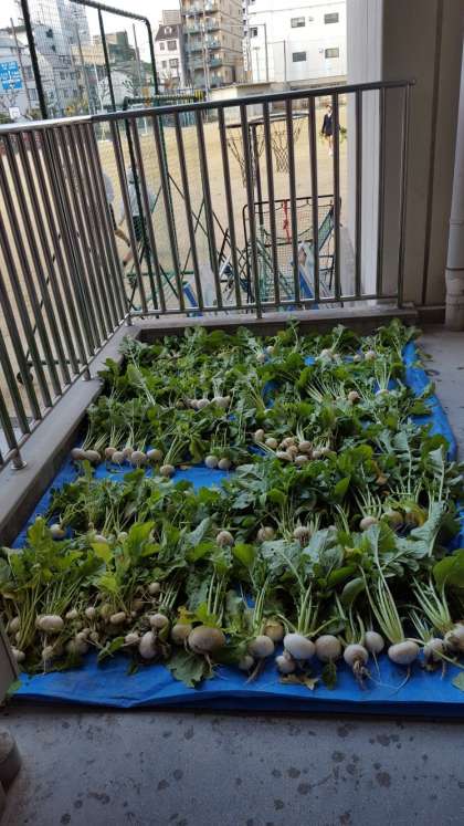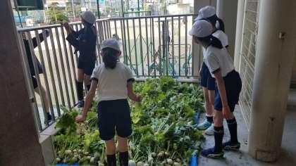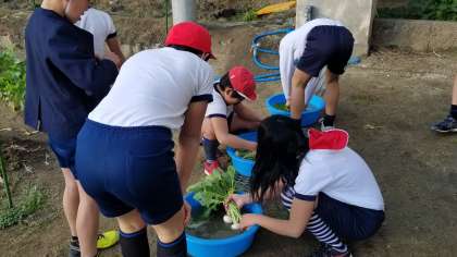 蕪を洗う水は冷たいけど、たくさん収穫できたので冷たさも我慢できます。子どもたちや教職員でしっかりと育てた結果です。