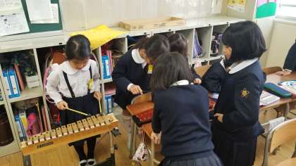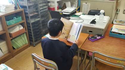 休み時間の様子です。楽器の練習をしていいます。読書をしている児童が読んでいる本は「枕草子と徒然草」でした。驚きました。