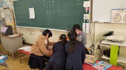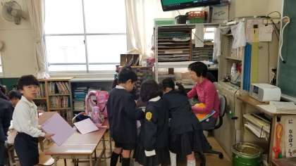 始業前の朝の様子です。1年生は毎朝、連絡帳やノートの提出を習慣づけています。担任の先生を囲んで楽しそうです。