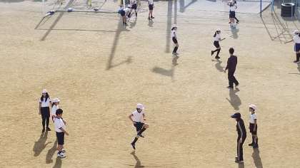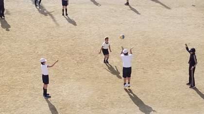 5年2組の体育の様子です。大縄跳びをしながらキャッチボールの運動をしていました。