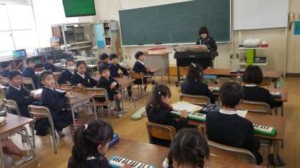 2年1組の音楽の様子です。パートにわかれて練習していました。最後は全体でとても上手に演奏できていました。