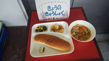 今日の献立は、豚肉と野菜のケッチャプ煮・きゅうりとコーンのサラダ・もものクラフティー・パン・牛乳です。