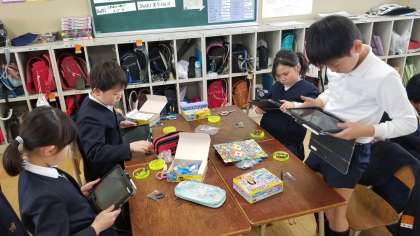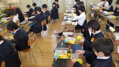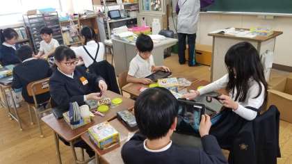 1組の理科の様子です。磁石の実験をしていました。下敷きを挟んでも金属がつくことを発見していました。また、その様子をタブレットで写真に記録していました。