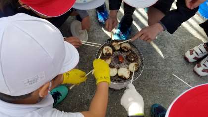 炭に火が付いたところで、おもちを焼いています。