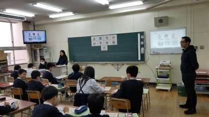 6年1組の英語学習の様子です。テープの英文を聞き取り答えています。