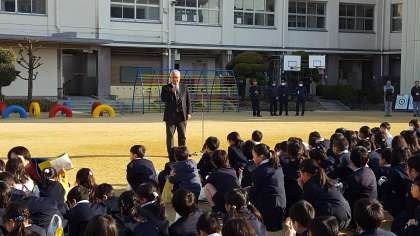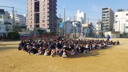 地震を想定した、「避難訓練」のあと、縦割り班による災害時の総合訓練を行っています。