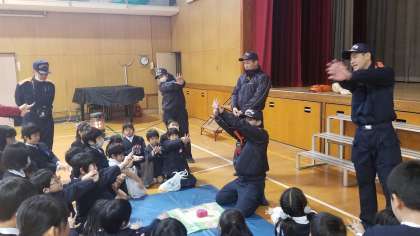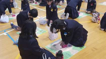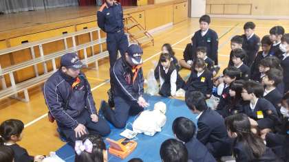 体育館では、心臓マッサージ(胸骨圧迫)やAEDの学習を行いました。天王寺消防署の方の説明や実演に、子どもたちは身を乗り出して聴いていました。
