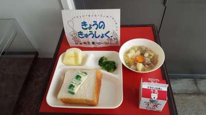 今日の献立は、鶏肉と野菜の洋風煮・ブロッコリーのサラダ・りんご・パン・牛乳です。