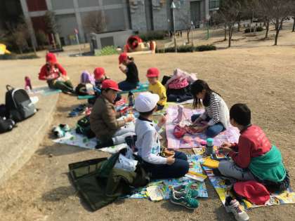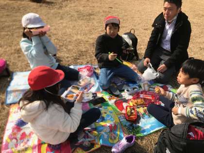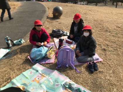 食事の様子です。扇町公園で食べました。真冬でもお弁当の時間は、一番の楽しみです。