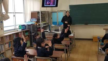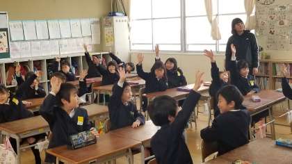 2年1組の英語活動の様子です。C-NETのダニー先生の授業です。ディズニーの映画やクイズを通して、楽しく英語に触れる授業でした。とても盛り上がっていました。