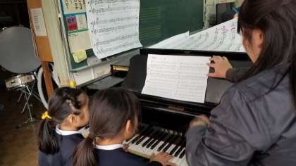 休み時間、音楽室で3年生がピアノの練習をしています。
