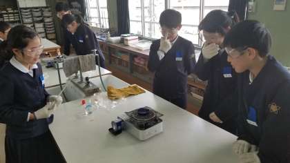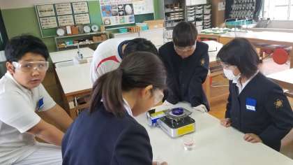 実験ゴーグルを着用して安全に学習しています。実験の結果を見つめる子どもたちの表情が素敵です。