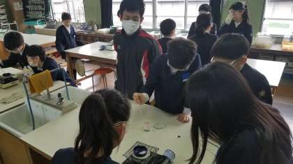 5年2組の理科の実験の様子です。「水よう液から、とかしたもの(食塩、ミョウバン)を取り出すにはどうすればよいだろうか。」という問題を実験で実証していきます。