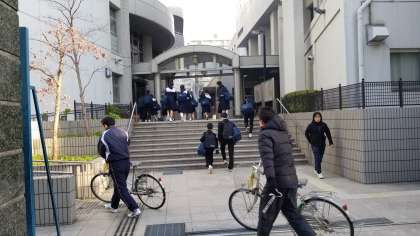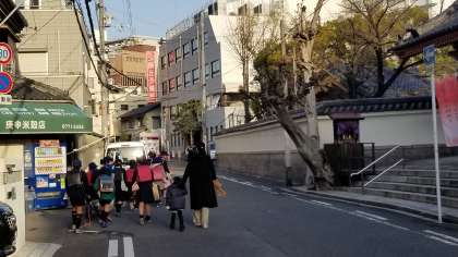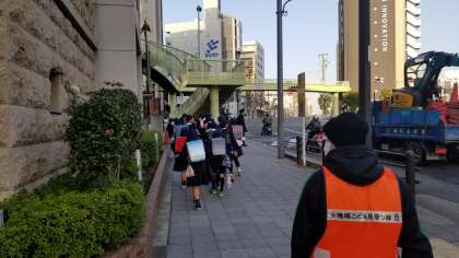 今日は登校指導・PTA交通安全指導の日です。見守り隊、PTA保護者と共に天王寺中学校も校区を巡回指導しています。