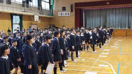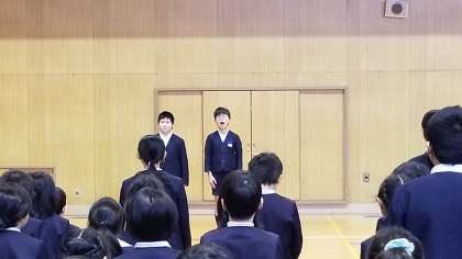 本日体育館で、児童集会を行いました。卒業生を祝う会の練習です。