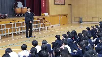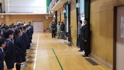 訓練終了後、体育館で警察の方による講評と命を守ることについてのお話を聞きました。とても有意義な訓練になりました。天王寺警察の皆さん、ありがとうございました。