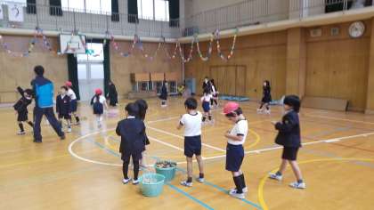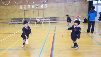1年2組の授業の様子です。幼稚園との交流に向けて、羽子板や駒回しの練習をしています。上手に教えてあげることができればいいですね。