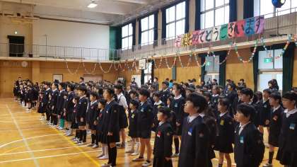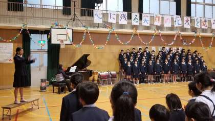 1時間目に体育館で「卒業生を祝う会」を行いました。会の進行は全て代表児童が行いました。