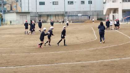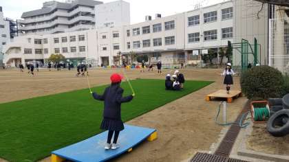 朝の様子です。トラックを走る児童やドッジボールをする児童、新しい人工芝で遊ぶ児童など、運動場は今日も元気な子どもたちでいっぱいです。