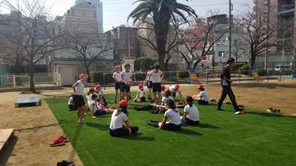 6年1組の体育の授業前の様子です。人工芝で楽しいそうな時間を過ごしています。何をしていたのでしょうか。