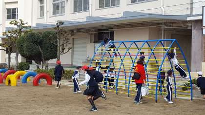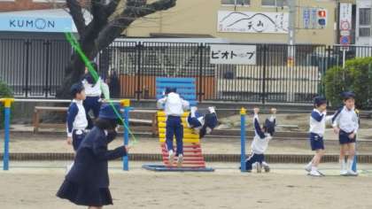 遊具を使ったり、鉄棒をしたり、馬跳びをして走り回っていました。